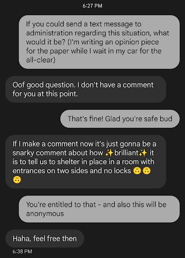 The physical threat seems to be all but vacated at this point, with students and faculty alike holding their breath for the notification that the building is now safe. Something tells me that when it comes, students will have a hard time believing it. At least, until there are proper locks on the doors.